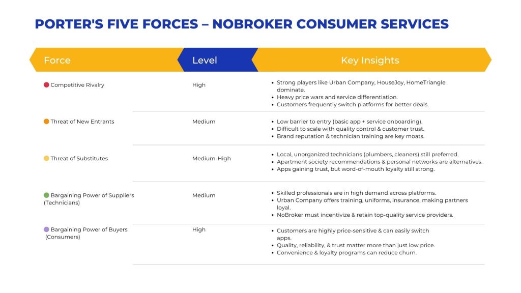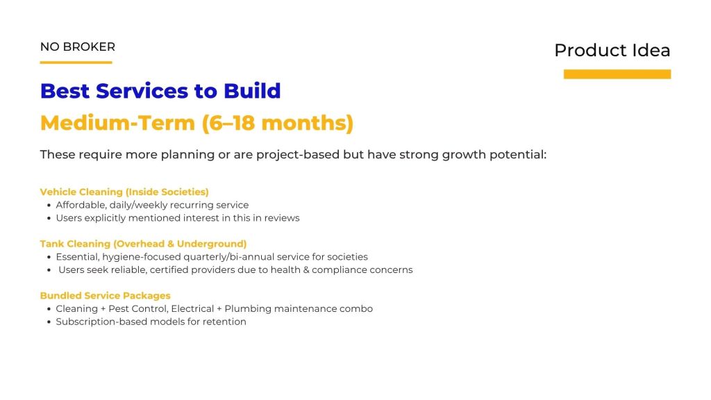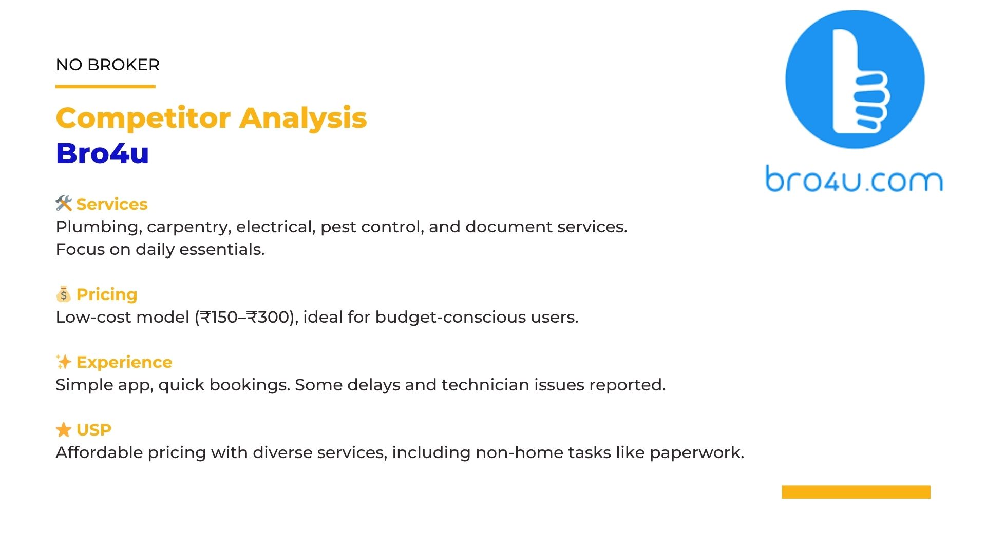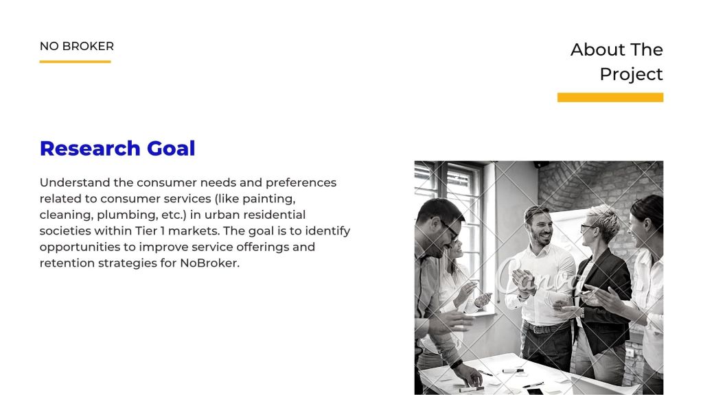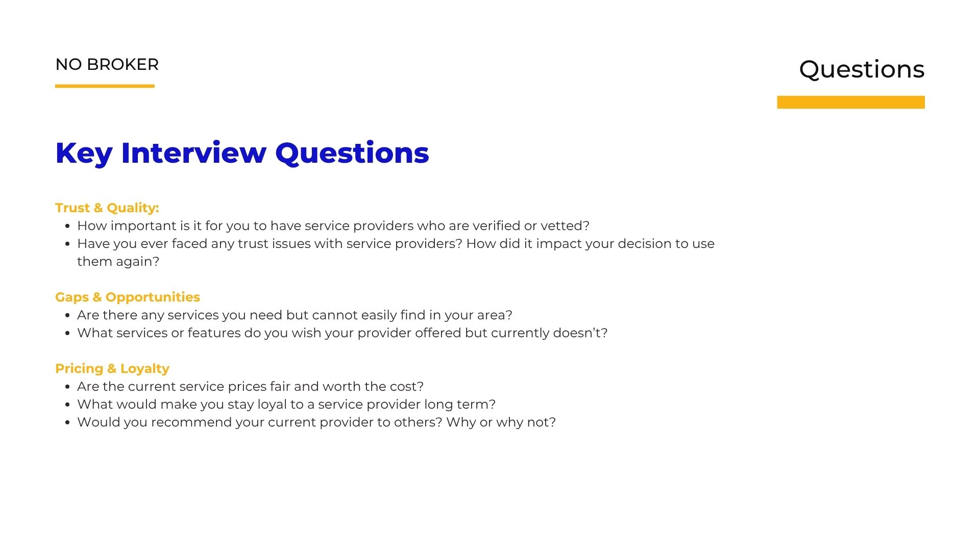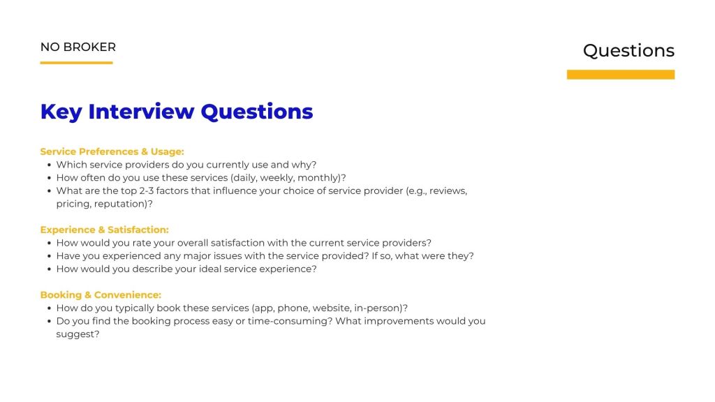 GOAL: This project aims to understand the needs of residents in Tier 1 urban societies and identify key gaps in home services like cleaning, plumbing, and painting. By analyzing user behavior, pain points, and competitor offerings, NoBroker is building a smarter, more reliable, and high-demand service ecosystem to improve user satisfaction and long-term retention.