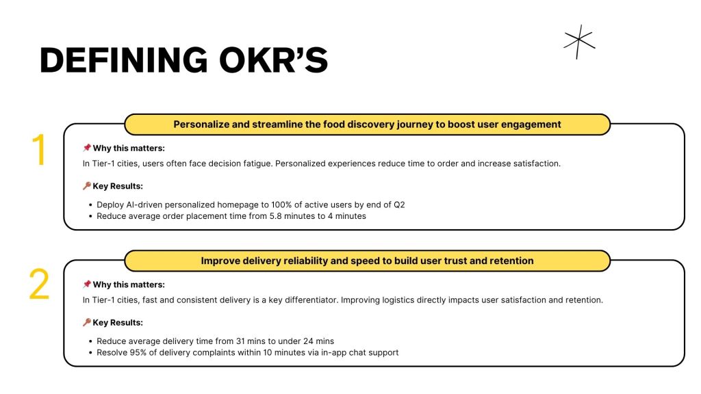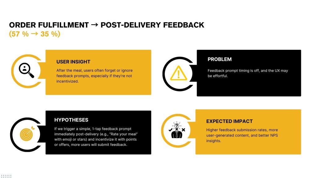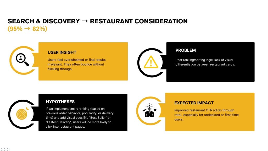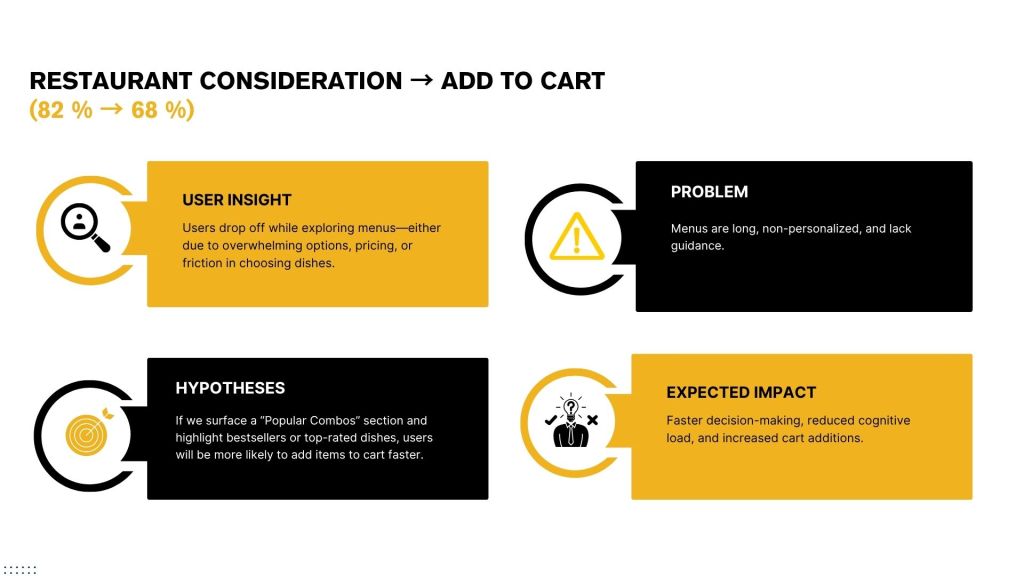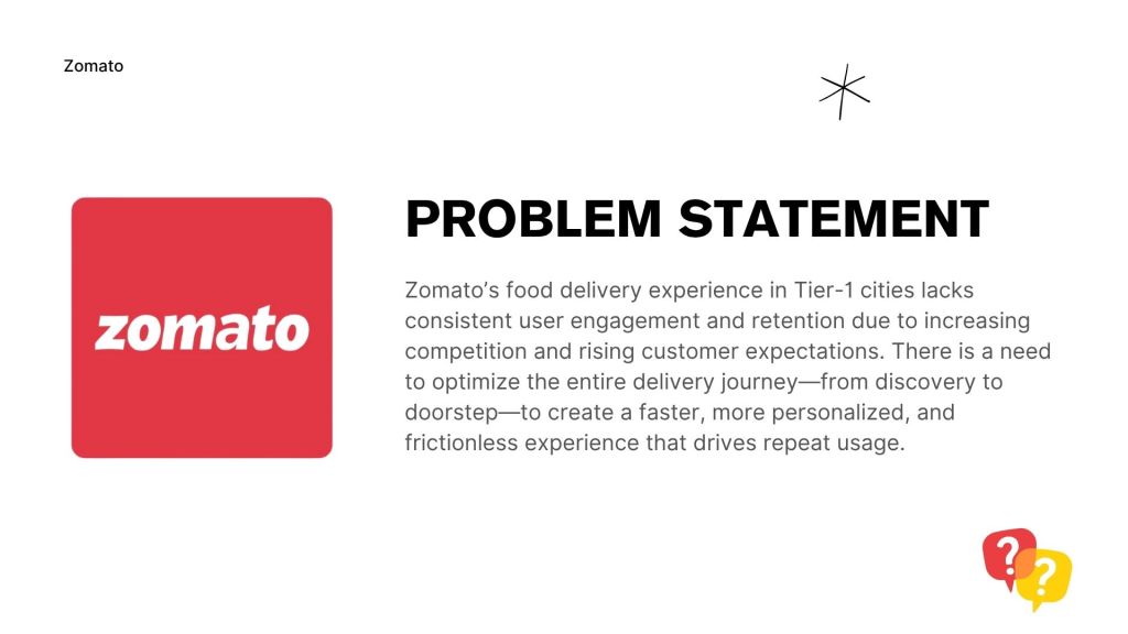 GOAL: To optimize Zomato’s food delivery experience in Tier-1 cities by reducing friction across the user journey—from discovery to delivery—to improve engagement, shorten order time, and drive higher retention through personalization, speed, and seamless UX.
